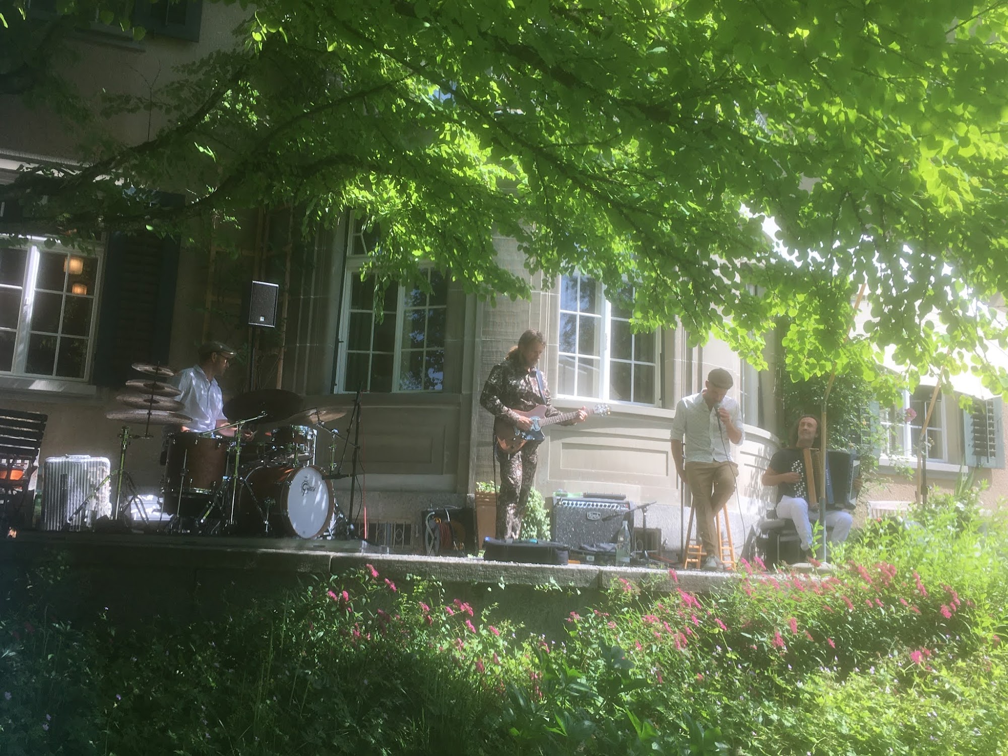 On 12 May 1999, I took the train to Winterthur to go to a unique solo-bass concert by one of my favorite musicians, Dave Holland. He played many of his own compositions, and other tunes from "God Bless the Child" to a composition by Anthony Braxton. Today, I took the train to Winterthur again to go to a noontime concert at Villa Sträuli featuring another favorite, singer Andreas Schärer, with the band A Novel of Anomaly: Kalle Kalima on guitar, Luciano Biondini on accordion, and Lucas Niggli on drums. It was my 19th concert by Andreas since I first saw him with his band Hildegard Lernt Fliegen in Willisau in 2012. (Andrew Shields, #111words, 3 July 2021)