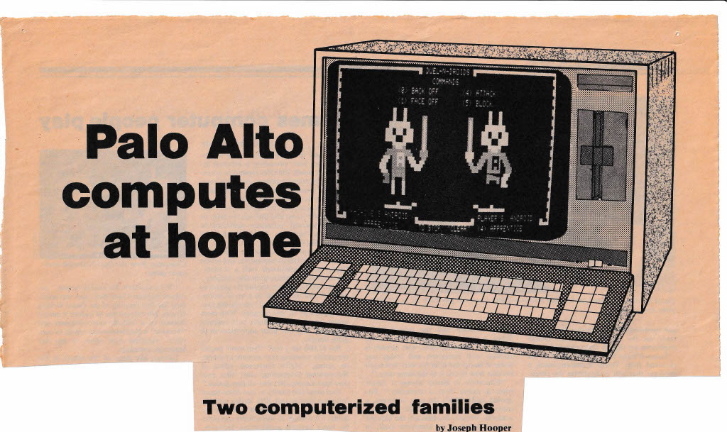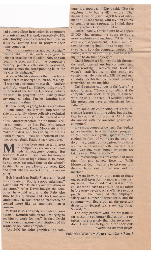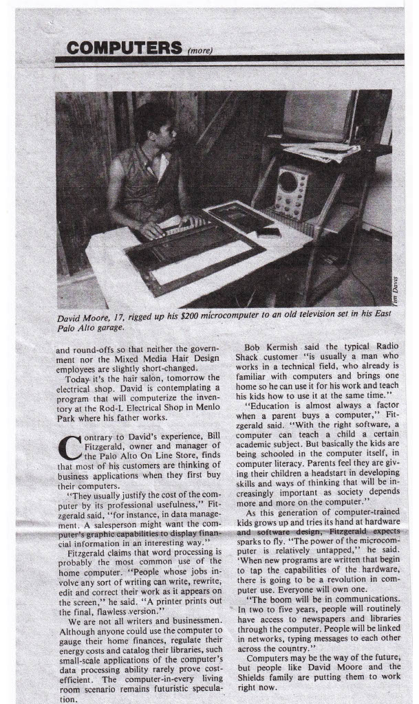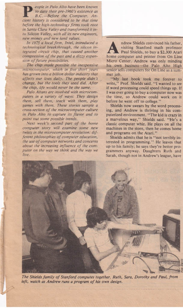 My mother gave me an article from the Palo Alto Weekly of 12 August 1981 that interviewed two families (one of them ours) about their use of personal computers. Among other things, the article mentions that I worked at On Line Micro Center, and the journalist, Joseph Hooper, also spoke with my boss Bill Fitzgerald. The shop was at the Palo Alto Square shopping center across the street from Palo Alto High School; I got the job there after spending an afternoon going from store to store asking if anyone had a job for me. I wrote about my job there in one of my daily texts back in June 2021. (Andrew Shields, #111words, 4 September 2022)
