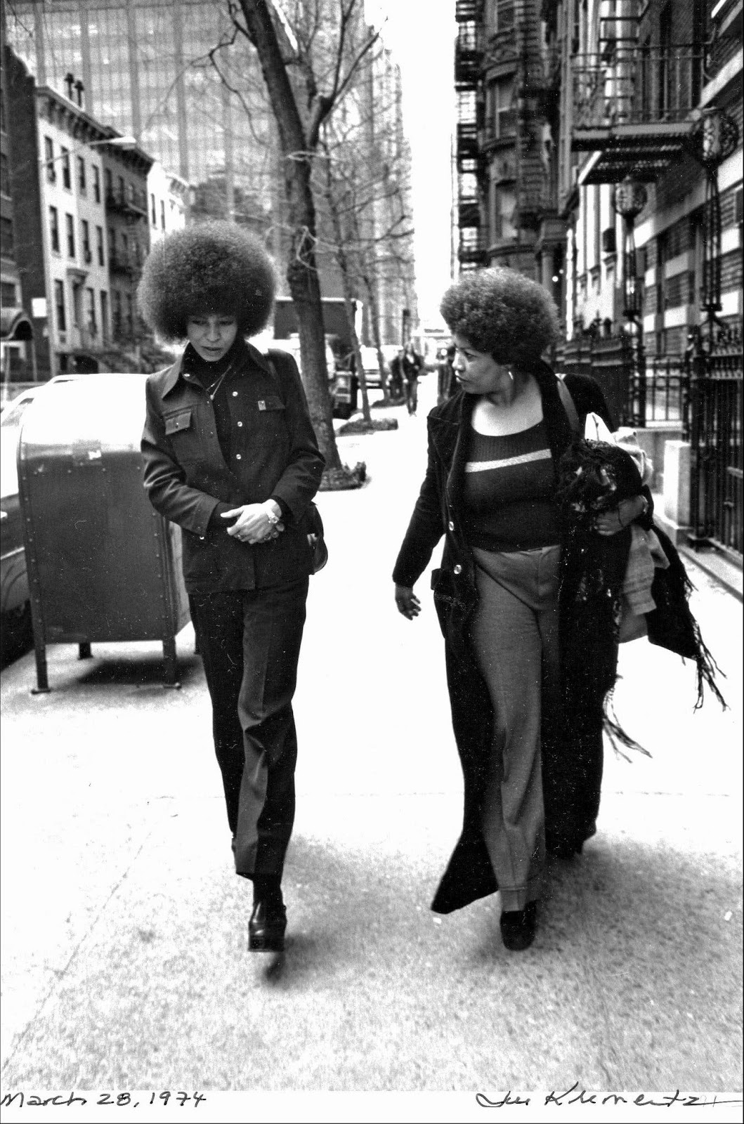 On 28 March 1974, Angela Davis and Toni Morrison walked down a street in New York City, and photographer Jill Krementz took a picture of them. One student in my Morrison seminar said Davis looks more "closed", with her hands clasped across her stomach and her jacket buttoned up, while Morrison looks more "open", with her jacket open, her throat uncovered, and her right arm swinging by her side. Another student pointed out that their Afro makes them look like it was the 1970s (as it was). I added that Morrison had published two novels already, but she was still a Random House editor, and Davis was one of her authors. (Andrew Shields, #111words, 20 February 2025)