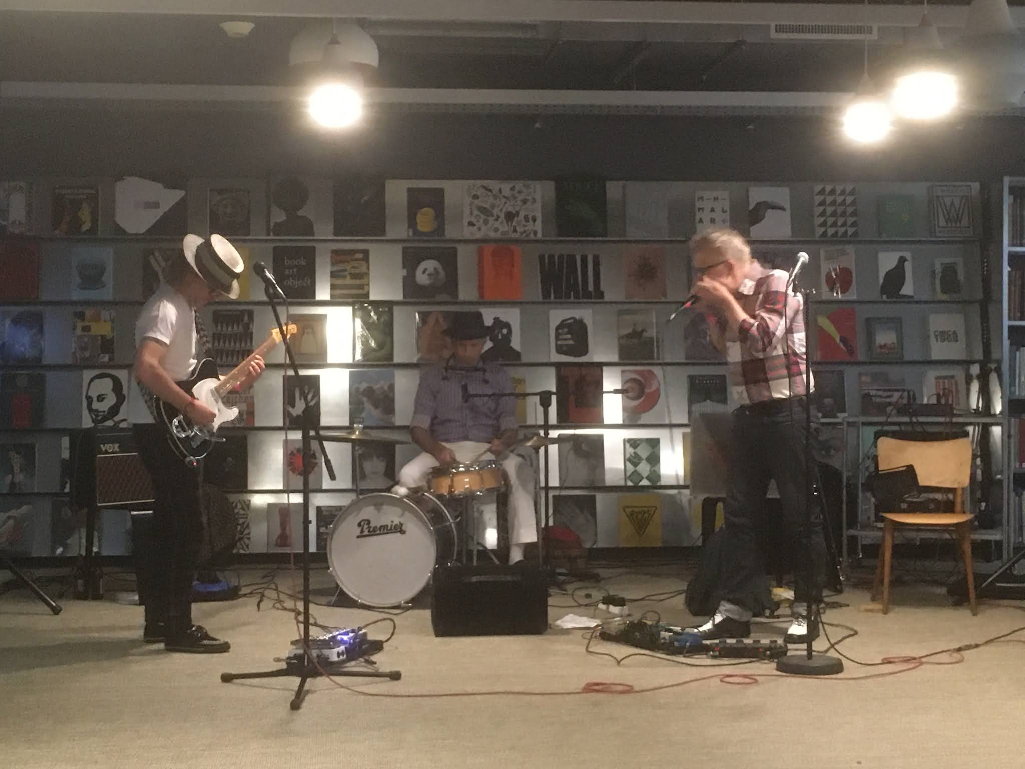 Three musicians set up their instruments in front of a wall of books in a library, one of which says WALL, while another features David Bowie, ready to listen to what they have to offer. There’s a drummer with a tiny set (hi-hat, snare, bass drum, cymbal, and sometimes a tambourine), an electric guitarist who only uses his microphone for backing vocals on one song, and a singer who plays jew’s harp through an effects board, as well as some harmonica. Antenna, Max, and Best play what they want to play, a kind of raucous outsider folk blues, and you can be like Bowie and listen as much as you like. (Andrew Shields, #111words, 4 September 2021)