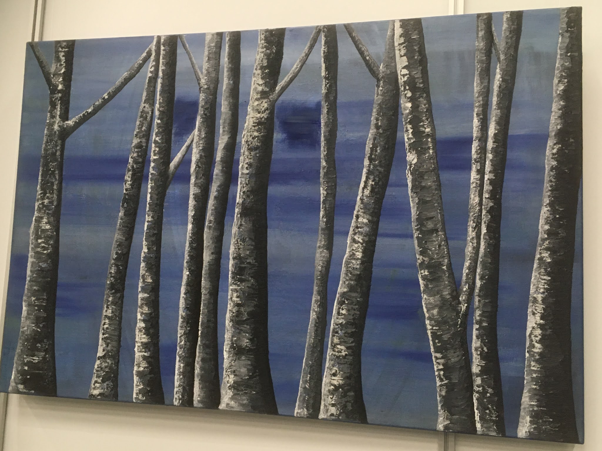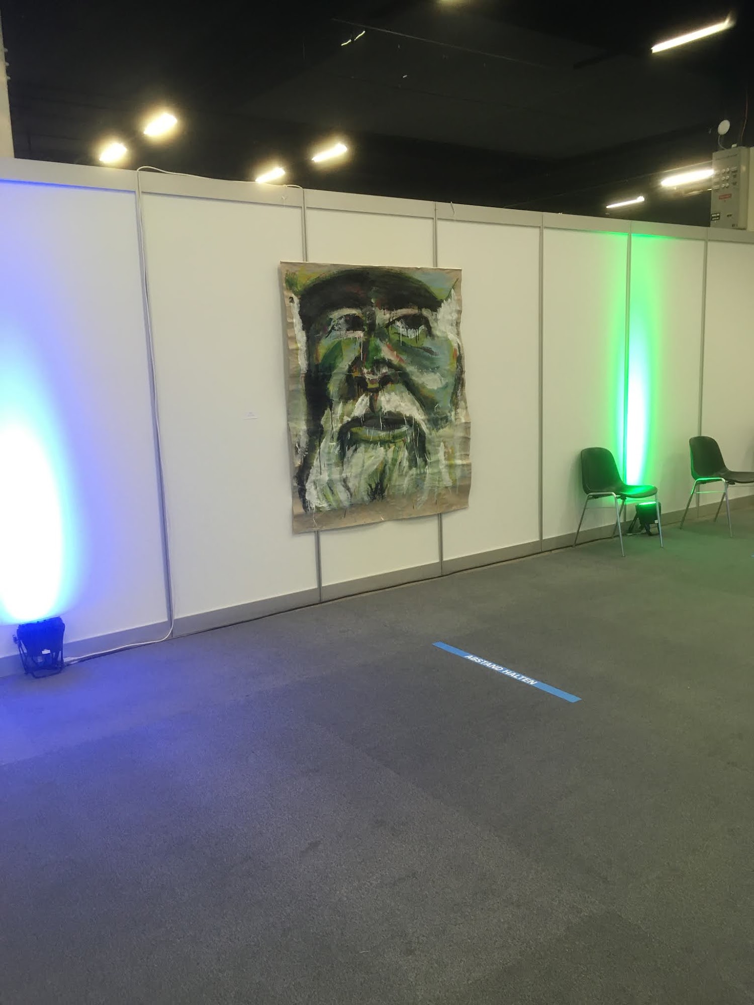 Outside the vaccination center is a line waiting for backpacks and purses to be checked, but it goes quickly. Inside is a first waiting area with lines of chairs, and someone says where to sit and when to go downstairs to where everyone gets their temperature checked and waits in more lines of chairs for registration. That goes quickly, and after even more chairs, there’s a single line to stand in where I take a picture of one of the striking paintings hanging everywhere. Then I get sent to room 18 for my shot of the BioNTech vaccine. After another line, I wait fifteen minutes beside another painting before going home. (Andrew Shields, #111words, 11 May 2021)