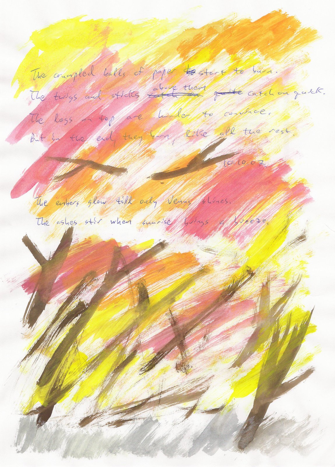 I knew she would want me to paint with/for her, but she paints much better than I do, so I started my own painting, of a campfire, on the page I had written a few lines on last night.