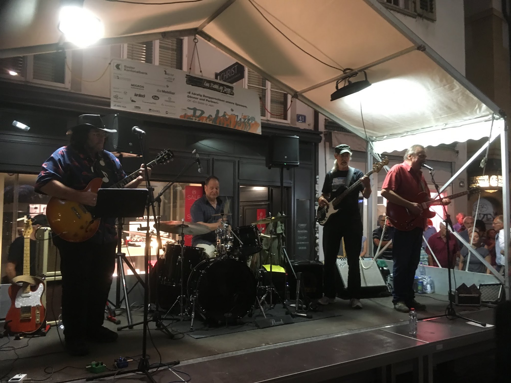 Since I arrived here in 1995, I've been impressed by range, quality, and history of the Basel music scene. Guitarist Cla Nett, who died yesterday at 64, was central to that history as the leader and co-founder of the Lazy Poker Blues Band, especially in its 1980s heyday. But I first heard him several times with Blues Nettwork, with his brother, my neighbor Jachen, on harmonica. When I finally heard Cla play with Lazy Poker in June 2018, I got to sing the final encore, "Dancing in the Streets", which I knew the phrasing of from versions by The Grateful Dead – whom Cla also loved and regretted never having seen live. (Andrew Shields, #111words, 28 September 2021)