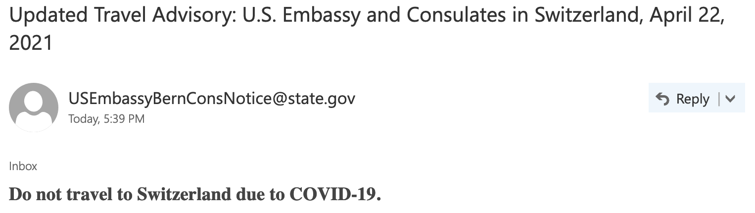 Today, I received an email from the US Embassy in Bern: "Do not travel to Switzerland due to COVID-19." I first read "do not travel-to-Switzerland-due-to-COVID-19" (don't make the disease a reason to travel here) rather than "do-not-travel-to-Switzerland due to COVID-19" (that is, the disease is why you shouldn't travel to Switzerland). The linguistic concept here is the "scope" of negation, that is, what it does and does not apply to. I first applied the negation to the whole travel-to-Switzerland-due-to-COVID-19 phrase, rather than only to travel-to-Switzerland. To avoid the ambiguity, my inner copy editor would either put a comma after Switzerland or rephrase it: "Due to COVID-19, do not travel to Switzerland." (Andrew Shields, #111words, 22 April 2021)