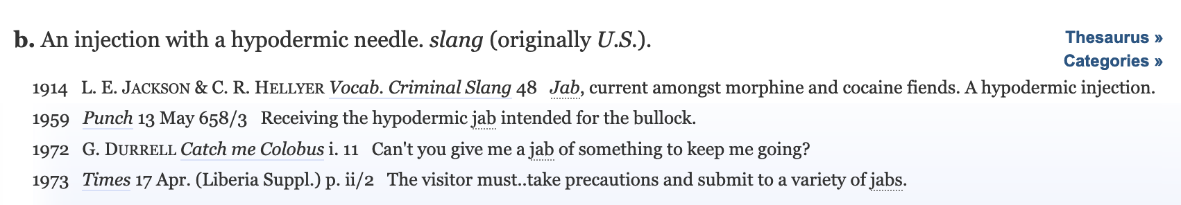 Although I've long heard my British friends in Basel call vaccinations "jabs", I still think of mine tomorrow a "shot". Yet I've noticed that many North Americans online have been calling their vaccinations "jabs". To check if that's an Anglicism, I looked up "jab" in the OED – and in 1914, "jab" as "an injection with a hypodermic needle" was originally slang among American morphine and cocaine users. Yet my sense that, until recently, "jab" was primarily British English is confirmed by the 2012-2013 data in the GLoWBE corpus, which has "flu jab" more common in the UK (354 uses to 11), and "flu shot" in North America (862 uses to 67). (Andrew Shields, #111words, 10 May 2021)