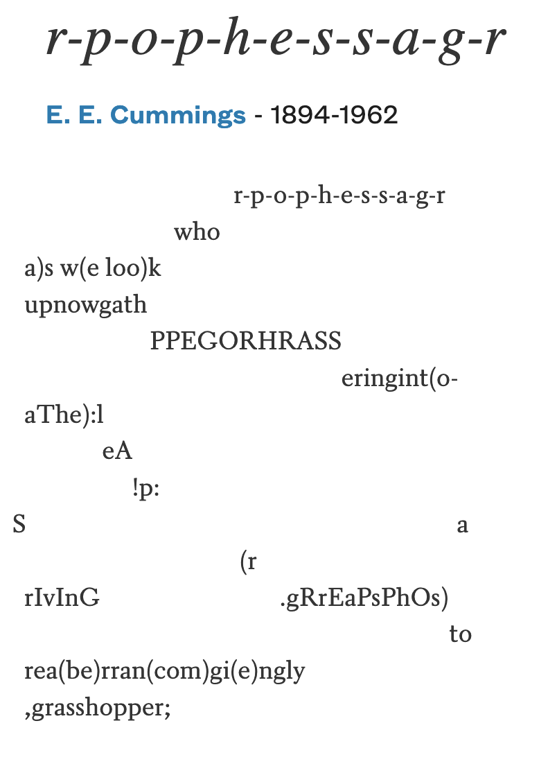 For a discussion of "r-p-o-p-h-e-s-s-a-g-r", by e. e. cummings, I collected questions and statements from internet posts by people trying to understand the poem. One asked, "How the heck do I read this poem?" Another said it looks like "a cryptic foreign language meant to be deciphered." A third called it "a waste of time", but then added that is nonetheless a great poem. A fourth asked two questions: "How is this a poem? Is this guy on drugs?" So I combined all these comments in a question for my students: "How the heck do you read this cryptic waste of time by a guy who might have been on drugs?" (Andrew Shields, #111words, 12 November 2021)