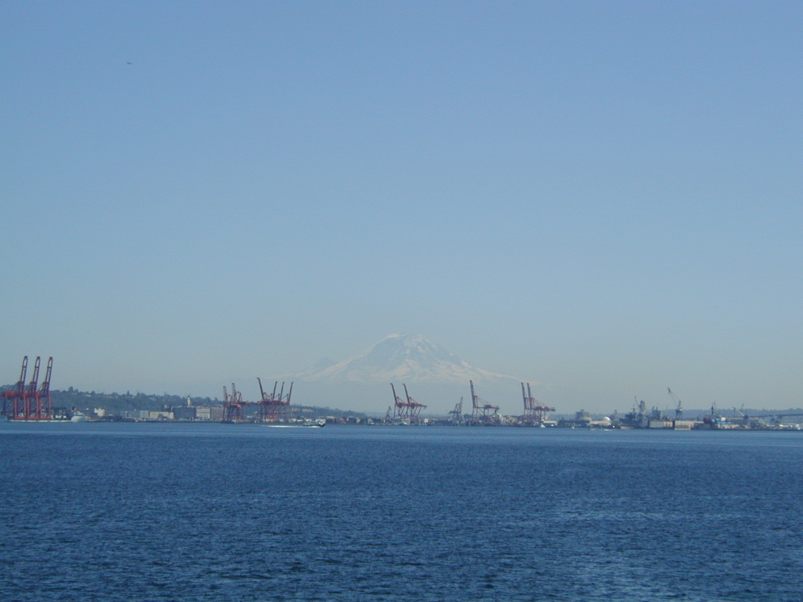 Seen up close from the tour boat, they were huge; from this perspective, they are dwarfed by the mountain in the distance. Someday, the Seattle skyline will surely be gone, and with it the cranes, but the mountain will remain.