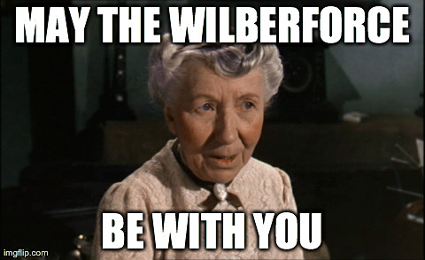 Katie Johnson (18 November 1878 – 4 May 1957) played Mrs. Wilberforce in Alexander Mackendrick's 1955 film "The Ladykillers", alongside Alec Guinness, Herbert Lom, and Peter Sellers as members of the criminal gang that rented herrooms in order to rob a security van at the adjacent railway station. The first words of Professor Marcus (Guinness) are spoken through the door after he rings the bell: "Mrs. Wilberforce?" As that echoes Guinness's famous line from George Lucas's "Star Wars" (1977), I created a meme years ago for "Star Wars" Day: a picture of Johnson captioned, "May the Wilberforce be with you". Only recently did I learn that Johnson died on 4 May. (Andrew Shields, #111Words, 4 May2025)