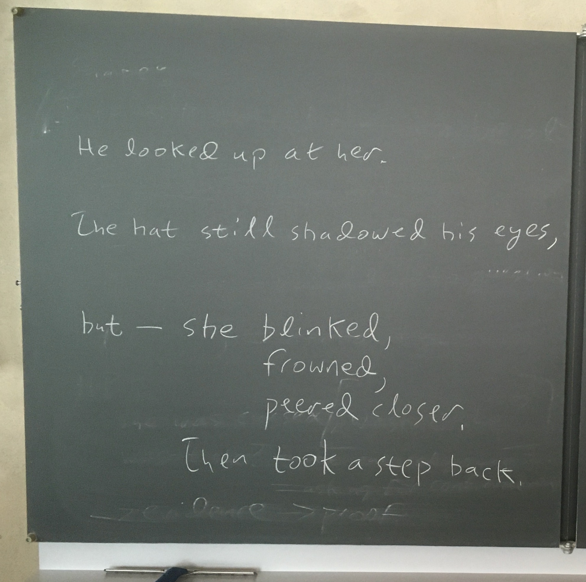 In discussing a passage from N. K. Jemisin's story "L'Alchimista" in class this week, I have been writing it down on the blackboard not as prose but with the layout of a free-verse poem, so as to highlight the pattern of the words: "He looked up at her. The hat still shadowed his eyes, but – she blinked, frowned, peered closer. Then took a step back." In particular, I wanted the sequence of verbs "blinked, frowned, peered [...] took" to be in a column. This made it easier to keep track of both the individual verbs and the overall effect of the sequence. It also raised the issue of form in prose. (Andrew Shields, #111Words, 26 September 2023)