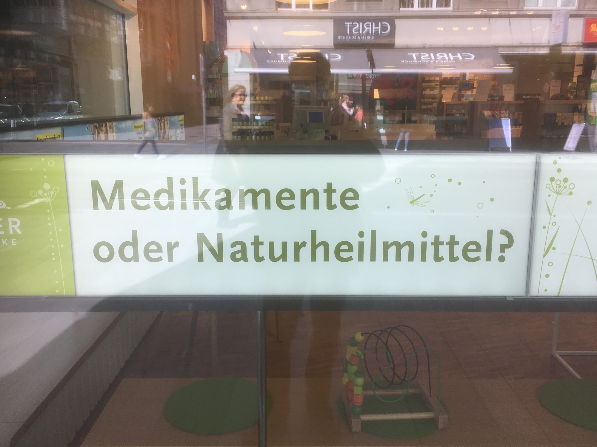 A pharmacy in Basel had a sign in their window: "Medikamente oder Naturheilmittel?" – "Medicines or Natural Remedies": This choice is also a sales pitch to appeal both to those who prefer "medicine" and those who prefer "complementary and alternative medicine", which would include such "natural means of healing" (to translate each word in that German compound). The provision of "alternatives" makes the pharmacy look open-minded, of course. But if this alternative obscures how any "natural remedy" can always be reclassified as "medicine" as soon its efficacy and safety have actually been demonstrated, it also betrays the fact that marketing, not medicine, is the essence of the "natural remedy" or "alternative medicine". (Andrew Shields, #111words, 13 May)