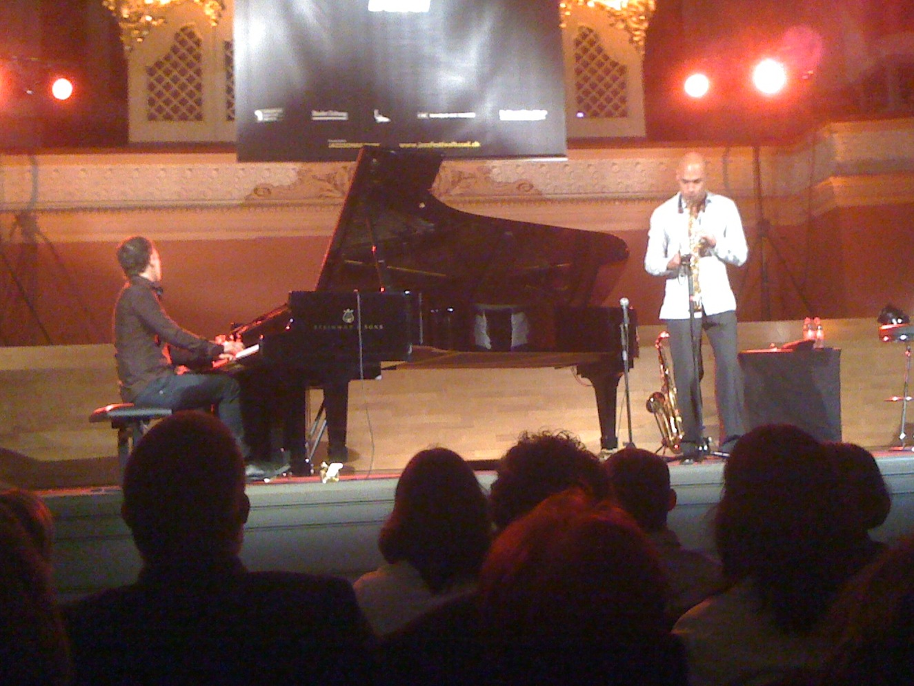 Brad Mehldau and Joshua Redman played as a duo at the Stadtcasino in Basel tonight. They opened with a Mehldau original called "The Falcon Will Fly Again," during which I was struck by how much Redman's playing has developed since I last since him early in the millennium. He was already very good, but his phrases and phrasing tonight were so much more fluid and individual then they had been back then. In contrast, I wondered if Mehldau had any more room to develop at all: I've seen him four or five times since I first saw him in a solo show at the Basel Art Museum in 1999 or 2000, and he's always been fantastic, so good that there's little room to develop. His playing on this first piece was fabulous, but for this diehard Mehldau fan, not very surprising.