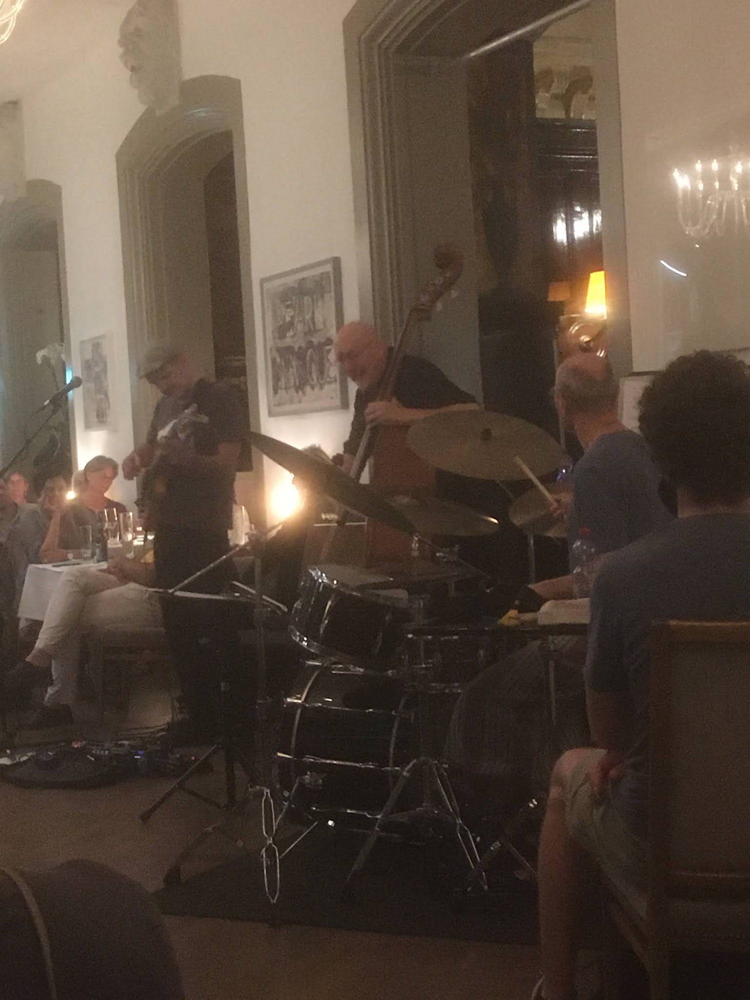 The last concert I attended was on 11 March 2020, when I saw Hildegard Lernt Fliegen at the Jazzhaus in Freiburg two days before the first Swiss lockdown was announced. Tonight, fifteen days after my second dose of coronavirus vaccine, I went to the garden of the Kunsthalle in Basel to hear Wolfgang Muthspiel, Scott Colley, and Jorge Rossy. Hearing the music was wonderful, of course, but seeing the musicians was, too: Muthspiel swaying back and forth to the rhythm as the music got louder and louder; Colley smiling again and again at Rossy's quick-witted playing; Rossy seamlessly switching from sticks to brushes to mallets to playing snare with his hands. (Andrew Shields, #111words, 23 June 2021)