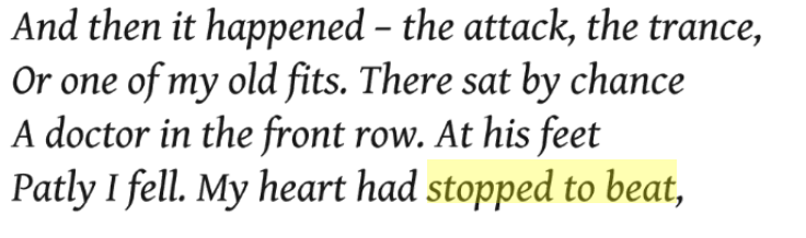 The first time I checked lyrics in English for a German-speaking friend in Basel, I found a mistake I knew from my students: "my heart stopped to beat" instead of "stopped beating." Since "beat" was a rhyme word in the song, I changed it to "ceased to beat". In the third canto of the poem-in-the-novel "Pale Fire" in Vladimir Nabokov's novel "Pale Fire", Nabokov's poet-character John Francis Shade makes the same mistake, again with "beat" as a rhyme word: "My heart had stopped to beat." Nabokov's solecism could be that of a non-native speaker, but I have now learned that he read and wrote English even before becoming literate in Russian. (Andrew Shields, #111words, 21 February 2021)