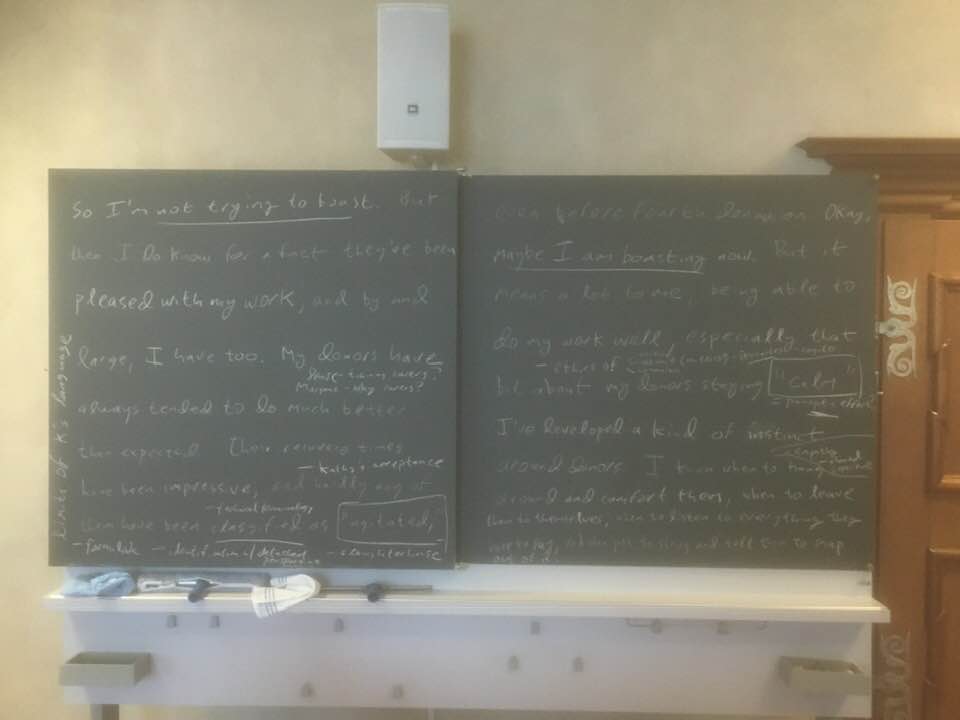 The blackboards from my class's discussion on 29 April of a passage from Kazuo Ishiguro's Never Let Me Go. This passage, to be precise, which is the first paragraph of the novel: My name is Kathy H. I'm thirty-one years old, and I've been a carer now for over eleven years. That sounds long enough, I know, but actually they want me to go on for another eight months, until the end of this year. That'll make it almost exactly twelve years. Now I know my being a carer so long isn't necessarily because they think I'm fantastic at what I do. There are some really good carers who've been told to stop after just two or three years. And I can think of one carer at least who went on for all of fourteen years despite being a complete waste of space. So I'm not trying to boast. But then I do know for a fact they've been pleased with my work, and by and large, I have too. My donors have always tended to do much better than expected. Their recovery times have been impressive, and hardly any of them have been classified as "agitated," even before fourth donation. Okay, maybe I am boasting now. But it means a lot to me, being able to do my work well, especially that bit about my donors staying "calm." I've developed a kind of instinct around donors. I know when to hang around and comfort them, when to leave them to themselves; when to listen to everything they have to say, and when just to shrug and tell them to snap out of it.<!-- /* Font Definitions */ @font-face {font-family:"MS 明朝"; mso-font-charset:78; mso-generic-font-family:auto; mso-font-pitch:variable; mso-font-signature:-536870145 1791491579 18 0 131231 0;} @font-face {font-family:"MS 明朝"; mso-font-charset:78; mso-generic-font-family:auto; mso-font-pitch:variable; mso-font-signature:-536870145 1791491579 18 0 131231 0;} @font-face {font-family:Baskerville; panose-1:2 2 5 2 7 4 1 2 3 3; mso-font-charset:0; mso-generic-font-family:auto; mso-font-pitch:variable; mso-font-signature:-2147483545 33554432 0 0 415 0;} /* Style Definitions */ p.MsoNormal, li.MsoNormal, div.MsoNormal {mso-style-unhide:no; mso-style-qformat:yes; mso-style-parent:""; margin:0cm; margin-bottom:.0001pt; text-align:justify; text-justify:inter-ideograph; mso-pagination:widow-orphan; font-size:12.0pt; font-family:Baskerville; mso-fareast-font-family:"MS 明朝"; mso-fareast-theme-font:minor-fareast; mso-bidi-font-family:"Times New Roman"; mso-bidi-theme-font:minor-bidi;} .MsoChpDefault {mso-style-type:export-only; mso-default-props:yes; font-family:Cambria; mso-ascii-font-family:Cambria; mso-ascii-theme-font:minor-latin; mso-fareast-font-family:"MS 明朝"; mso-fareast-theme-font:minor-fareast; mso-hansi-font-family:Cambria; mso-hansi-theme-font:minor-latin; mso-bidi-font-family:"Times New Roman"; mso-bidi-theme-font:minor-bidi;} @page WordSection1 {size:612.0pt 792.0pt; margin:72.0pt 90.0pt 72.0pt 90.0pt; mso-header-margin:36.0pt; mso-footer-margin:36.0pt; mso-paper-source:0;} div.WordSection1 {page:WordSection1;}