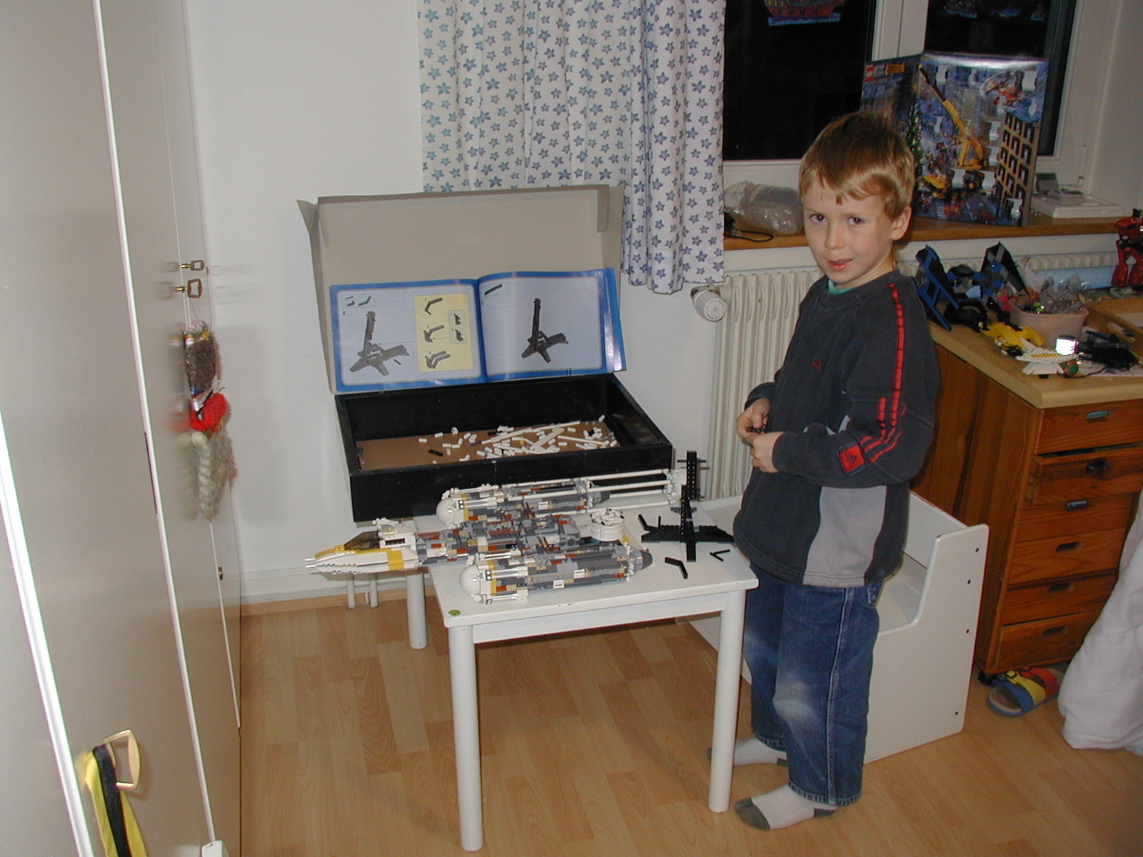 Miles got a huge Lego Star Wars set for his birthday, a Y-Wing Attack Starfighter. Since he finished building it, he has had it on the top of a bookshelf in his room. Today, he wanted to get it down, and I said it was not a good idea.
