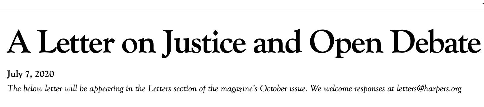 One year ago today, Harper's published "A Letter on Justice and Open Debate". On Twitter, trans people read it as a direct attack on them. When I read it, I was struck by how such a bland text of strawmen and clichés could be read so specifically. When I posted my two texts on the letter in various threads, including a Facebook post supporting it, two women in Scotland who'd been criticized for transphobia took issue with my interpretations and said they'd specifically felt defended by the letter. So though the letter said nothing about transgender issues, both transgender people and those accused of being transphobic felt it was about them. (Andrew Shields, #111words, 7 July 2021)