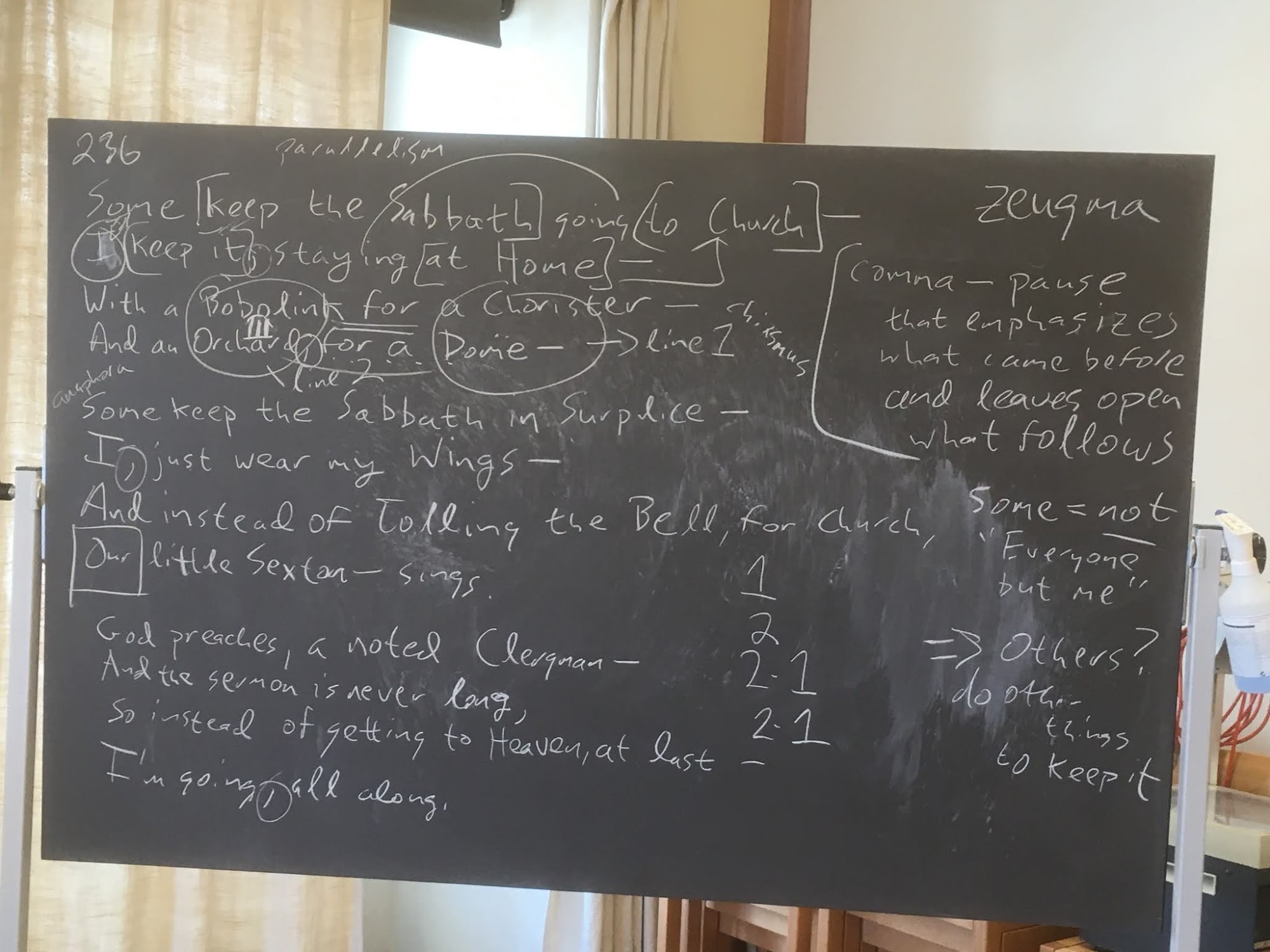 One year ago today, I had my last in-person classes (111 Words a Day and an Emily Dickinson seminar). The University of Basel went online on for the rest of the spring semester Monday, 16 March. While some courses were taught in person when the fall semester started in September, all mine were online, and as the second wave hit much harder in Switzerland than in the spring, even those in-person courses went back online. By now, I've been able to adapt my talk-and-chalk teaching style to Zoom sessions, with me typing extensive notes during discussions, and I wonder how to adapt that to in-person classes when they finally start again. (Andrew Shields, #111words, 13 March 2021)