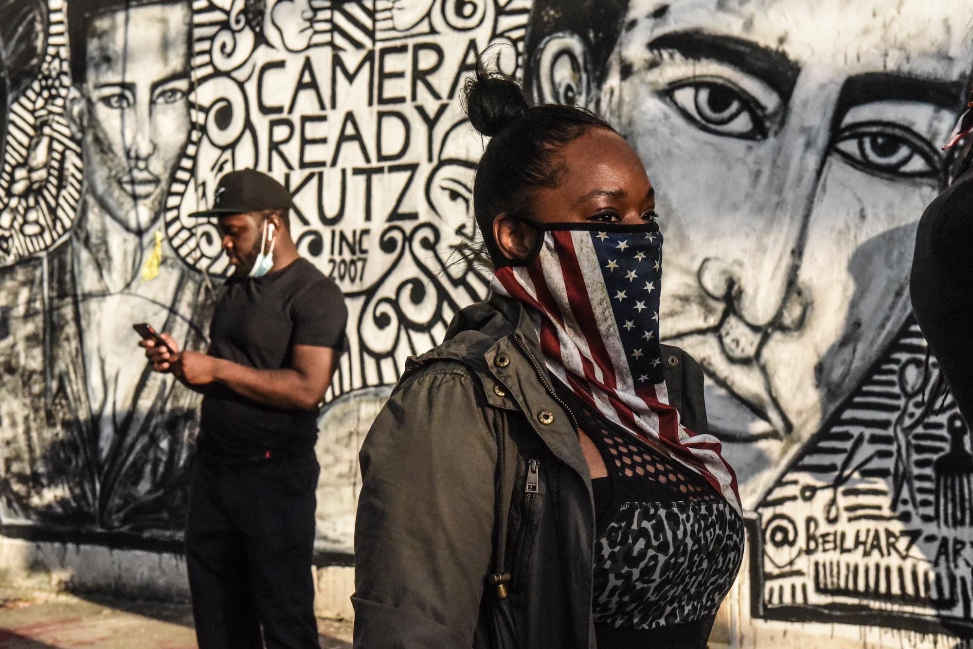 Camera Ready Kutz is a Brooklyn barbershop "geared towards, but not exclusive to, the LGBTQIA community". Outside is a black-and-white mural in the background of Stephanie Keith's photograph from yesterday's demonstration; the foreground is a woman in a mask made out of an American flag. The red-white-and-blue stands out in this black-white-and-brown scene: the black-and-white mural; her brown skin with the sun on her forehead; the brown skin of the man in black behind her, his white mask under his chin. This is the "brave space" of the barbershop, of the demonstration, of this American woman, brown in a land that makes her black, but claiming the red-white-and-blue as her own. (Andrew Shields, #111words, 2 June)
