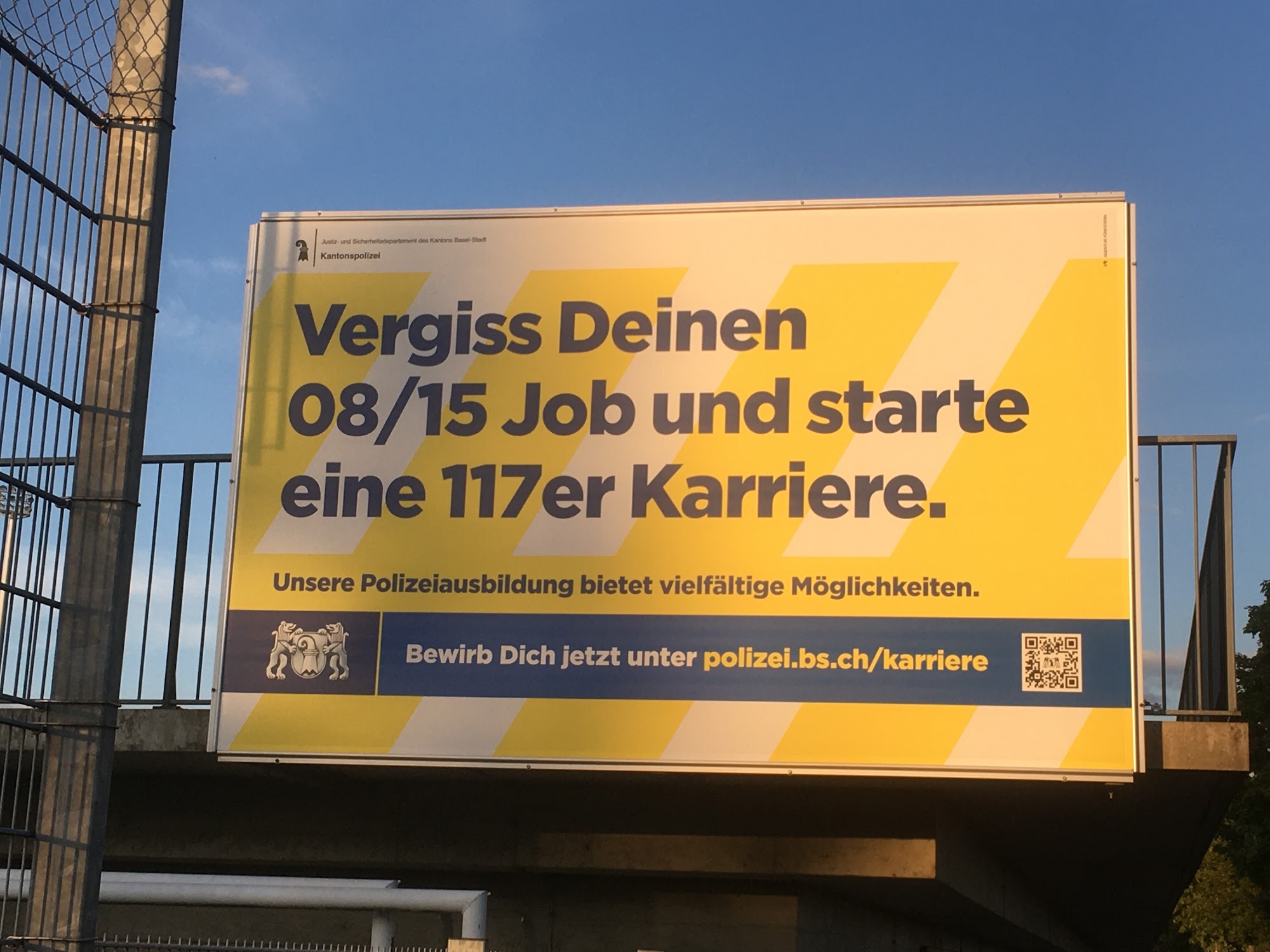 The police department of the canton of Basel-Stadt has advertised for new recruits with a numerical slogan: "Vergiss Deinen 08/15 Job und starte eine 117er Karriere" ("Forget your 08/15 Job and start a 117 career"). While "08/15" can be translated as "run-of-the-mill", "117" is the emergency phone number to call the police in Switzerland. In other words, leave the dull routine of your current job for the excitement and variety of being a police officer. The irony is that the expression "08/15" comes from a standard machine gun used by the German Army during World War One. I wonder if the creators of the advertisting campaign intended that irony or not. (Andrew Shields, #111words, 2 September 2023)