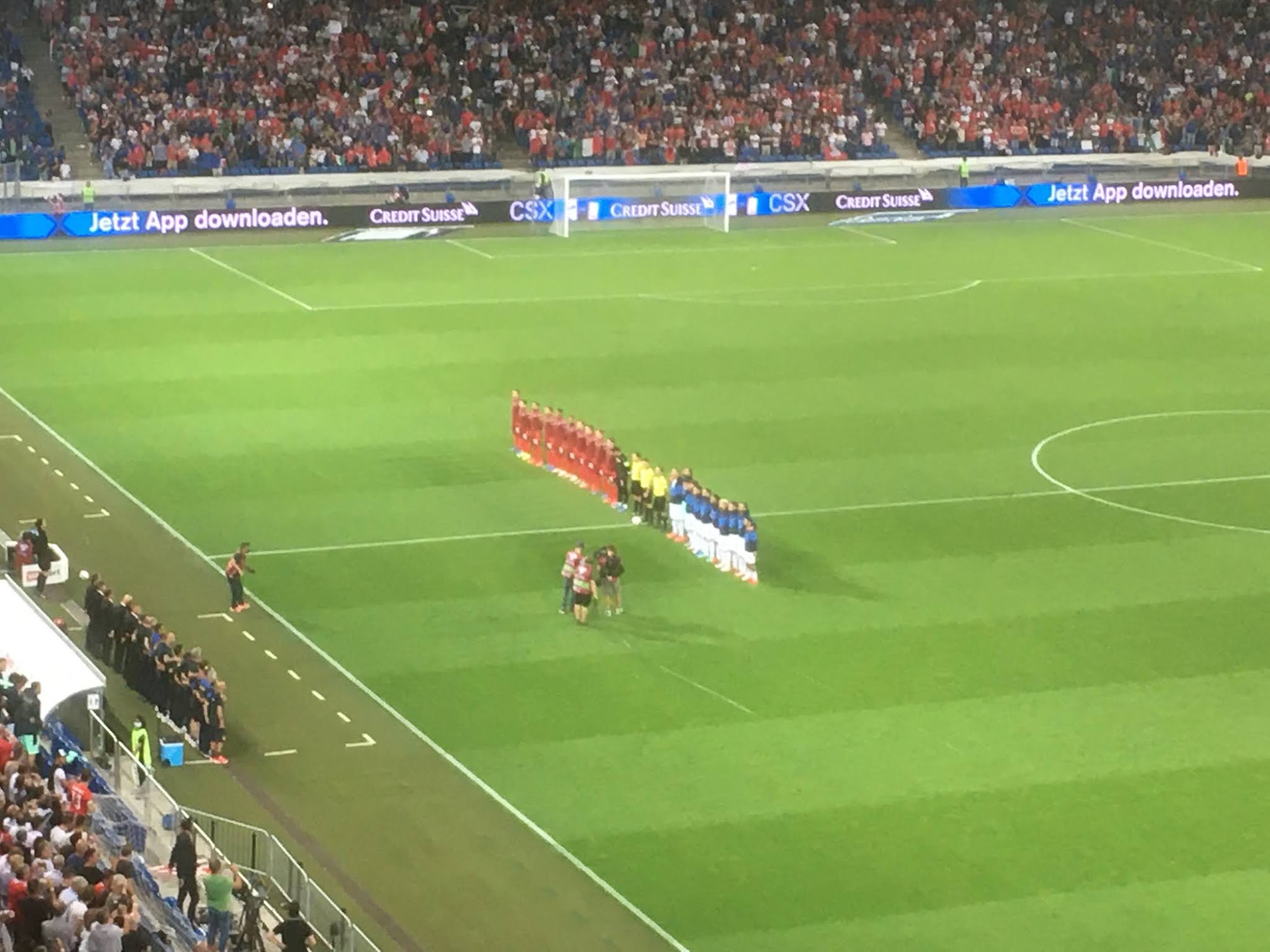The coronavirus pandemic was not very present at this evening's World Cup qualifying match between Switzerland and Italy at the St. Jakob stadium in Basel. To enter the stadium, spectators did have to have a coronavirus certificate certifying their vaccination, recovery, or recent negative test, and the staff checking the certificates, bags, and tickets were wearing masks, as were all the servers at the concession stands. But once I'd gotten to my seat, I only noticed one effect of the pandemic: the teams could still use the five substitutions that were introduced when matches began to be played again in late spring 2020. It's a rule that I hope becomes permanent. (Andrew Shields, #111words, 5 September 2021)