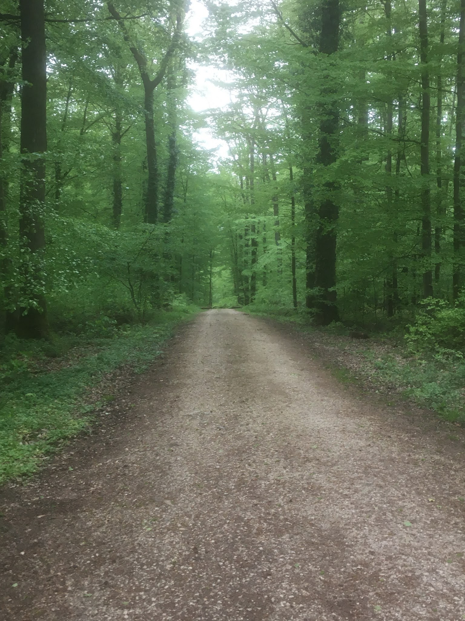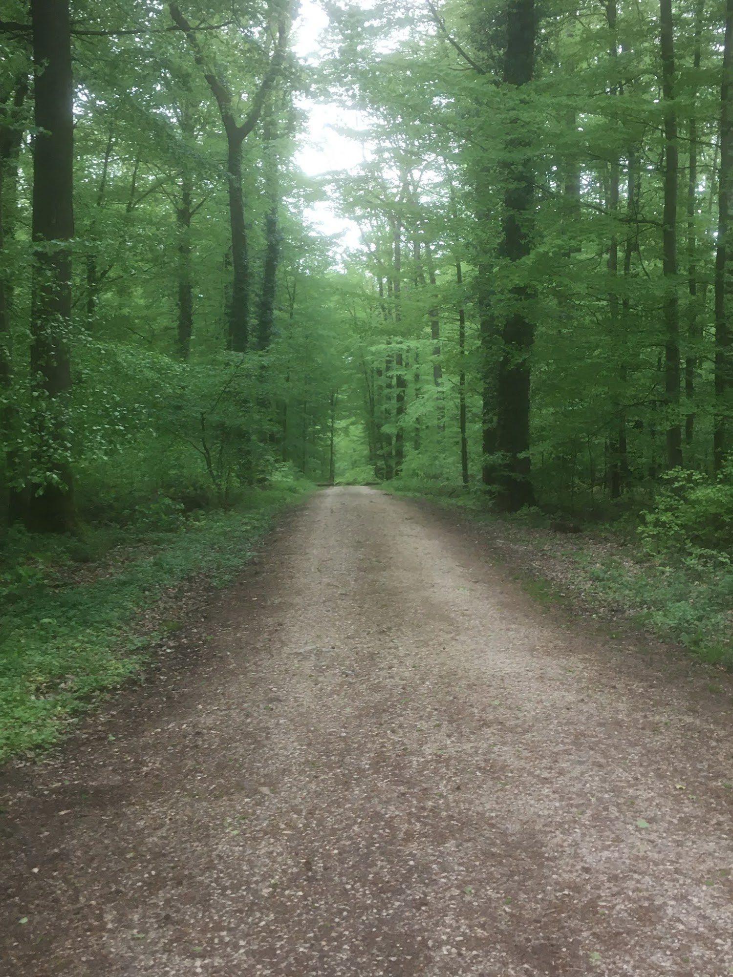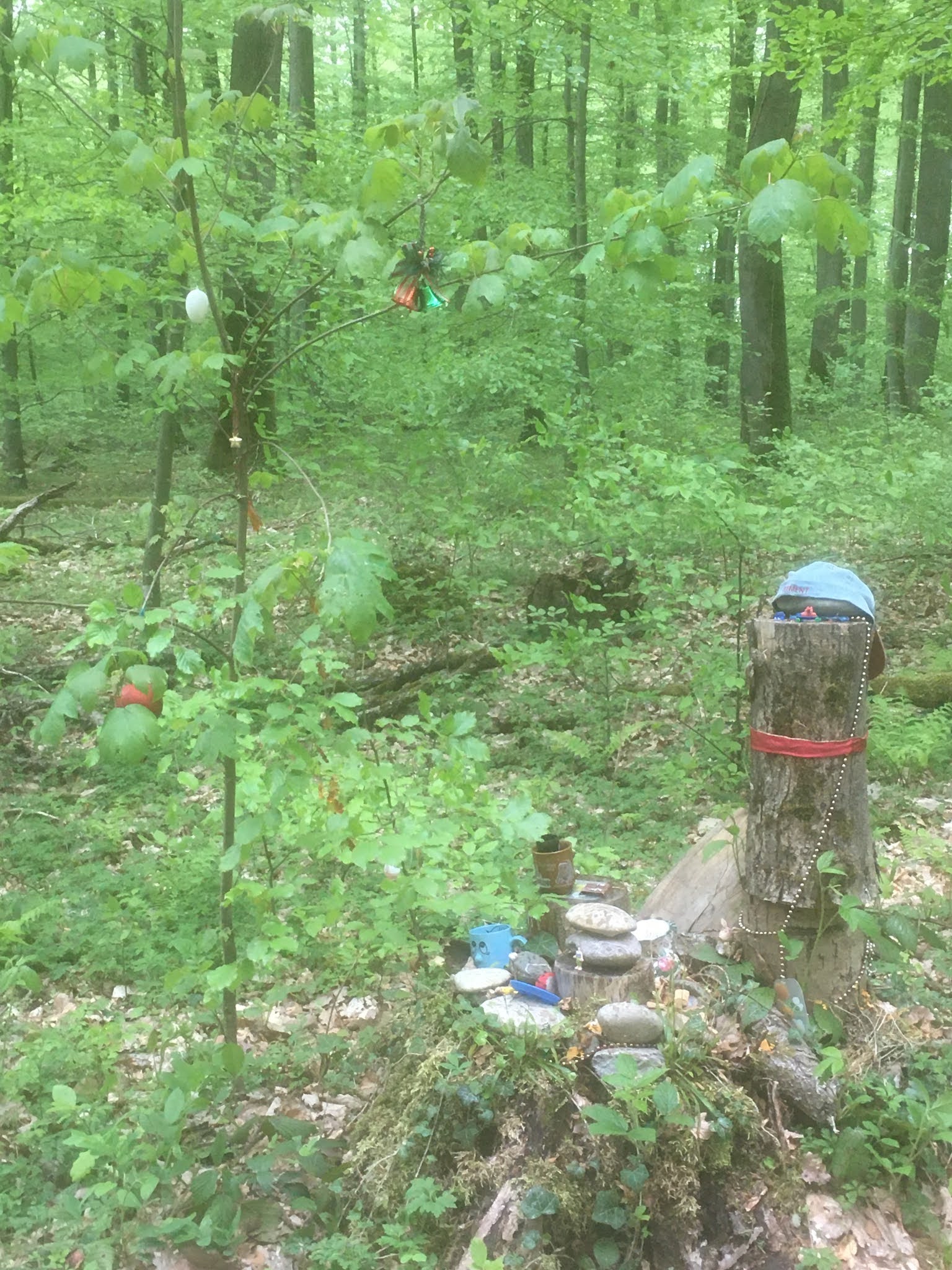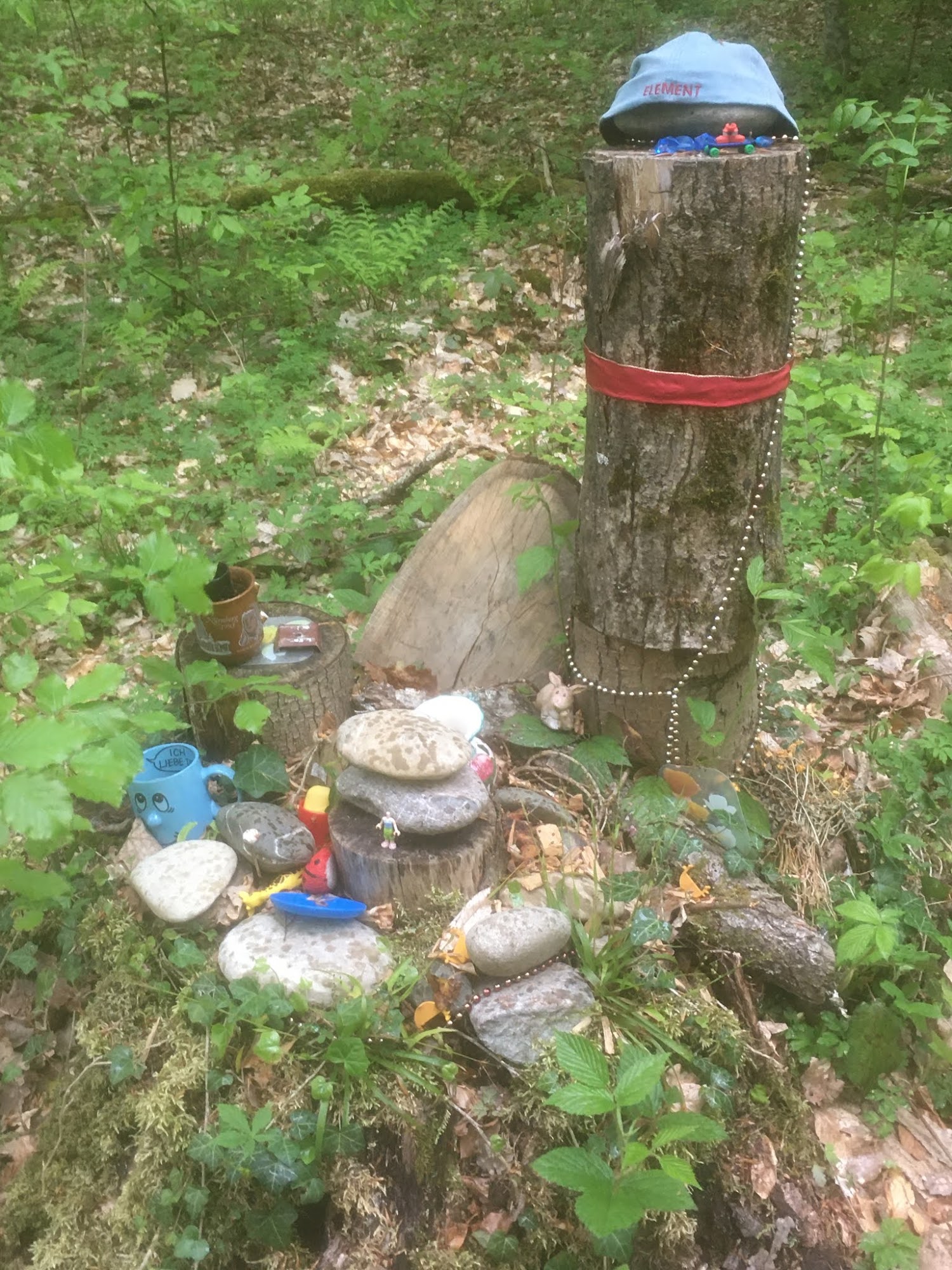 While my daughter Luisa was riding in Rümmingen for two hours early this evening, I went for a long, windy, slightly rainy walk around the countryside, exploring paths I hadn't taken before. I found myself on a road through beautiful, well-tended woods vibrant with springtime green. Such woods are typical in Germany, but beyond the excellent forestry, I also noticed that they are typical of the opening scenes of murder mysteries on German television. The thought was enough to make it a little bit uncanny to be walking there alone, but then I came across an unusual yet reassuring scene: beside the road, a tree stump that some children had decorated. (Andrew Shields, #111words, 4 May 2021)